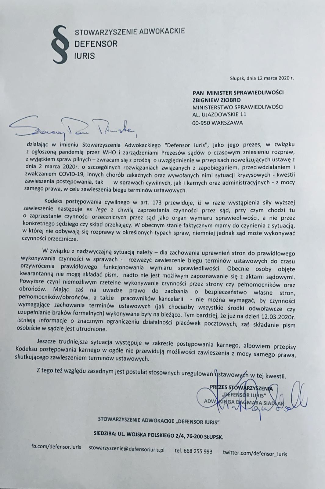 ✉ Tego samego dnia Prezes Stowarzyszenia adwokat Kinga Dagmara Siadlak wystąpiła z publicznym apelem skierowanym do władz Rzeczypospolitej Polskiej, a w szczególności do Ministra Sprawiedliwości, o podjęcie działań legislacyjnych związanych ze wstrzymaniem biegu terminów ustawowych dla czynności procesowych o materialnoprawnych – poprzez ich zawieszenie. Stanowiło to ponowienie wcześniejszego apelu, gdyż Ministerstwo Sprawiedliwości nie udzieliło odpowiedzi, a terminy nadal biegną i sytuacja staje się coraz poważniejsza. [Zobacz wystąpienie]
